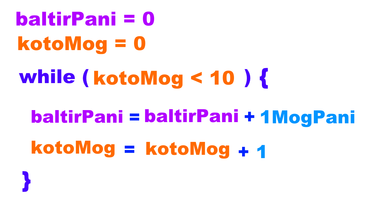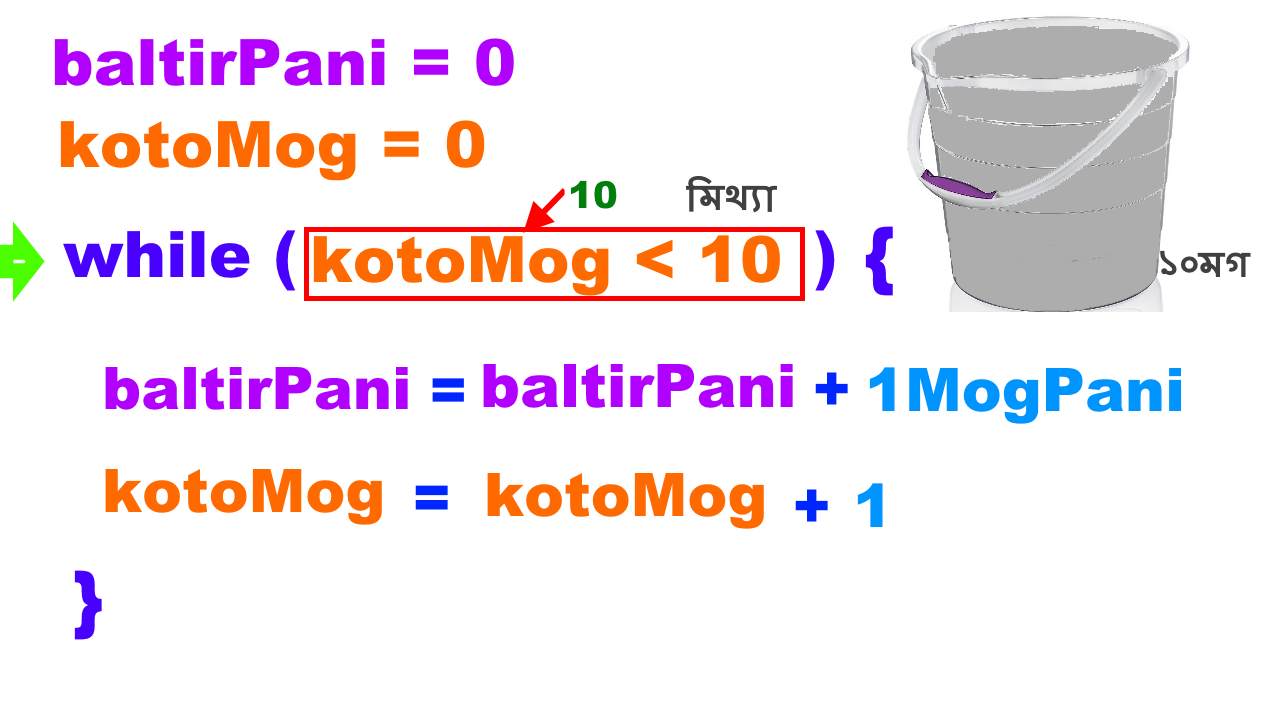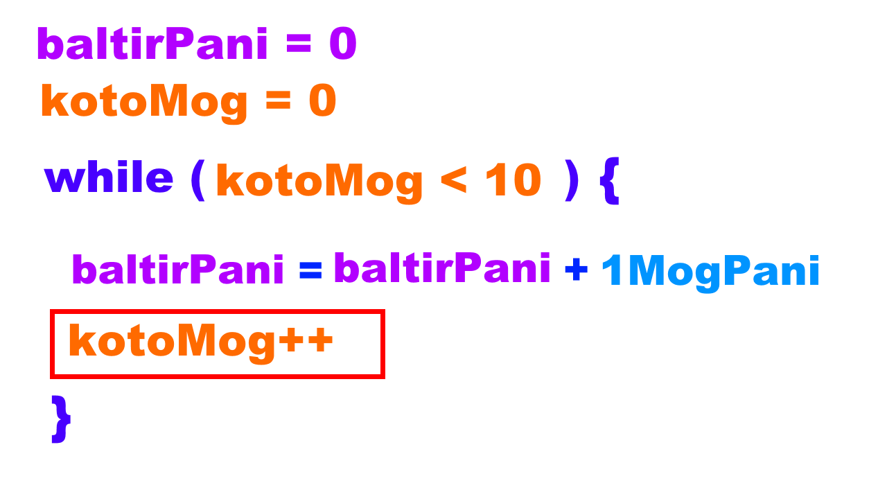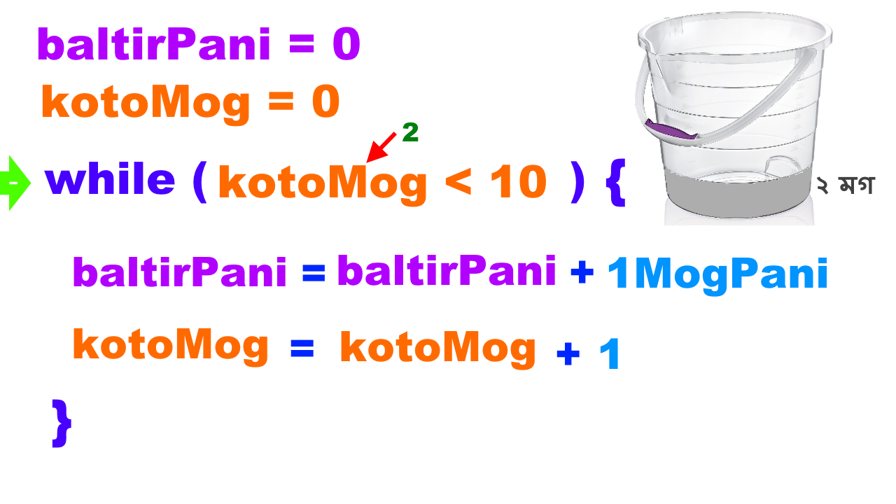 সেকেন্ড ব্র্যাকেটের ভিতরে, প্রথম লাইনের সমান চিহ্নের পর আছে বালতির পানি এবং এর বর্তমান মান শূন্য, আর এর মধ্যেই আপনি এক মগ পানি ঢাললেন। তাহলে এই লাইন শেষ হয়ে যাওয়ার পর বালতির মধ্যে পানির পরিমাণ দাঁড়াবে এক মগ। তারপর সে পরের লাইনে যাবে, সেখানে গিয়ে সমান চিহ্নের ডান পাশে দেখবে ‘kotoMog’ ভ্যারিয়েবলের মান শূন্য এবং আপনি যেহেতু এক মগ পানি ঢেলে ফেলেছেন, সেহেতু শূন্যের সাথে এক যোগ করা হবে এবং এরপর ‘kotoMog’ ভ্যারিয়েবলের মান দাঁড়াবে ‘১’। এখন while এর ভিতরের কাজ একবার করা শেষ। এই ভিতরের কাজ আবারো করা লাগবে কিনা, সেটা জানার জন্য সে আবার while এর পরে প্রথম ব্র্যাকেটের ভিতরের শর্তের কাছে যাবে। সেখানে গিয়ে দেখবে ‘kotoMog’ ভ্যারিয়েবলের মান ১ যা ১০ এর চেয়ে ছোট। অর্থাৎ শর্তের মান সত্য। তাই সে আবার while লুপের সেকেন্ড ব্র্যাকেটের মধ্যে ঢুকবে এবং সেখানে আরও এক মগ পানি যোগ করবে এবং এর ফলে বালতির মোট পানির পরিমাণ হবে ২ মগ। পরের লাইনে আসবে kotoMog’ ভ্যারিয়েবলের মান ছিল এক এবং এর সাথে আরও ১ যোগ করবে যার ফলে ‘kotoMog’ এর মান হবে ২।