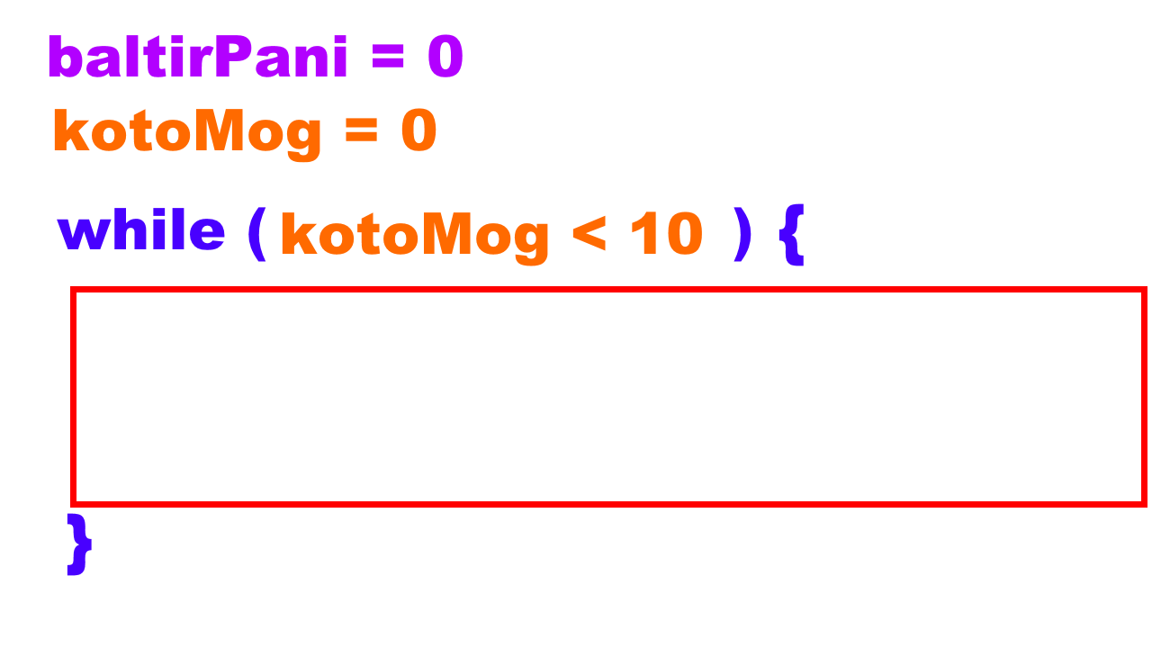 আপনার সাথে কথা হয়েছে আপনি ১০ মগ পানি ঢালবেন। এই কথাটিকে যদি আমরা উলটিয়ে দেখি, তার মানে হচ্ছে আপনি ততক্ষণ পর্যন্ত পানি ঢালবেন যতক্ষণ না পর্যন্ত পানি ঢালার সংখ্যা ১০ হয়। এর মানে হচ্ছে, আপনি যে উপরে একটা ভ্যারিয়েবল দিয়েছিলেন ‘kotoMog’, সেই ভ্যারিয়েবলের মান যতক্ষণ ১০ না হয়, ততক্ষণ পর্যন্ত আপনি পানি ঢালতে থাকবেন। এই পুরো জিনিসটাকে প্রোগ্রামিংয়ের ভাষায় লিখে while কত মগ ভ্যারিয়েবলের মান ১০ এর কম ততক্ষণ পর্যন্ত এই যে আপনি ২টা সেকেন্ড ব্র্যাকেট দিয়েছেন, সেই ব্র্যাকেটের ভেতরের কাজ বা কাজগুলো আপনি করতে থাকবেন।