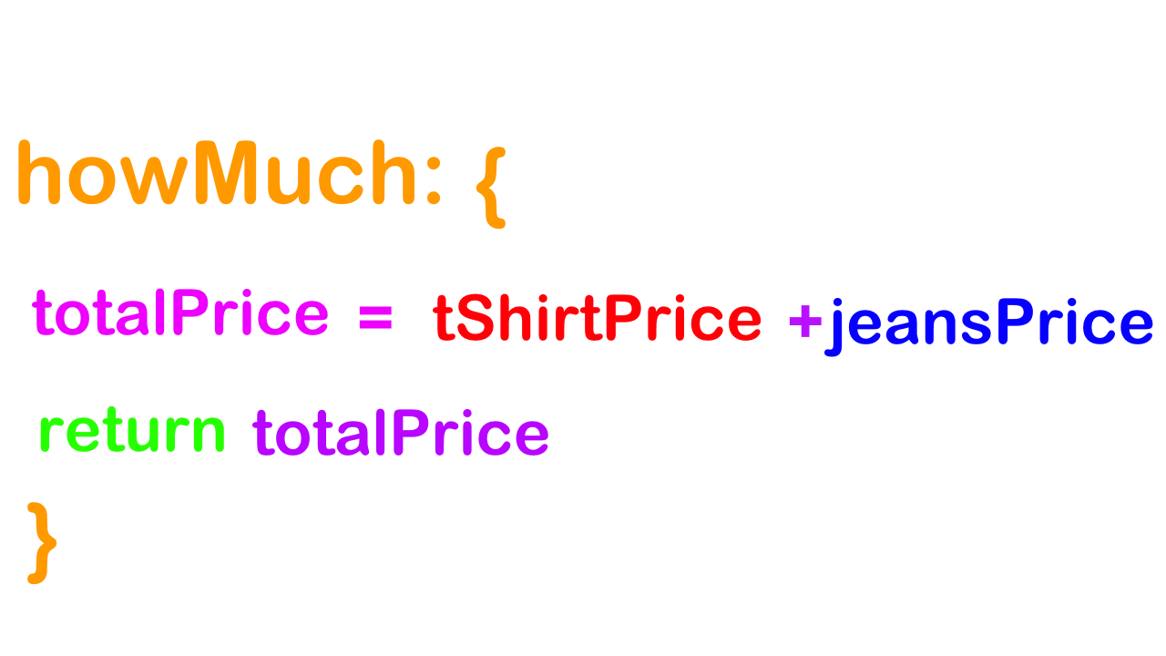 কোনো একটা প্রোগ্রাম লিখতে হলে, সেটার একটা নাম দিতে হয়। সেই নাম ধরে ডাক দিলে প্রোগ্রামের মধ্যে যা যা করার কথা থাকবে। সেগুলা করে আপনাকে একটা রেজাল্ট বা আউটপুট দিবে। এই যেমন, আপনি যদি রফিক ভাইকে, জিগ্যেস করেন, সর্বমোট কত হইছে। তাইলে উনি howMuch প্রোগ্রামটাকে ডাক দিবে। এই প্রোগ্রামের মধ্যে, আরেকটা ভ্যারিয়েবল আছে, যেটার নাম হচ্ছে, totalPrice. এই totalPrice এর মধ্যে, tShirtPrice আর jeansPrice এই দুইটা জিনিস যোগ করে যোগফল রাখে। তারপর যোগফলটা রিটার্ন করে দেয়, জাস্ট return totalPrice লিখে।