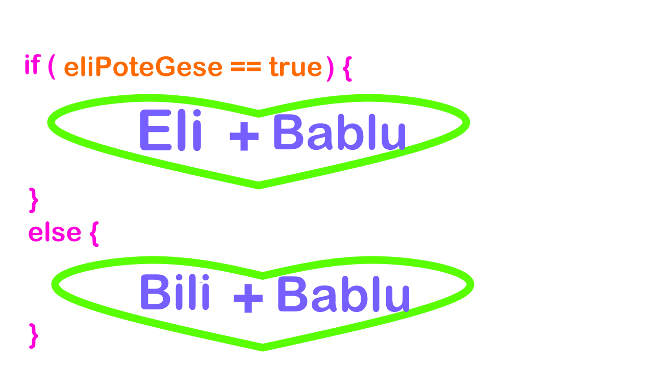 এই জিনিসটা আরেকটা উদাহরণ দিয়ে দেখানো যায়। ধরেন, আপনি ইলি আর বিলি নামে দুইজনের সাথে লাইন মারার চেষ্টা করতেছেন। আপনি যদি ইলিরে পটায় ফেলতে পারলে eliPoteGese এর মান সত্যি হবে। আর ইলি যখন পটে যাবে, তখন আপনি কোনো দেয়ালে বা গাছের মধ্যে লিখে আপনার প্রেম অমর করতে চাইবেন। তখন ওয়ালে গিয়া লিখবেন, Eli + Hablu ।