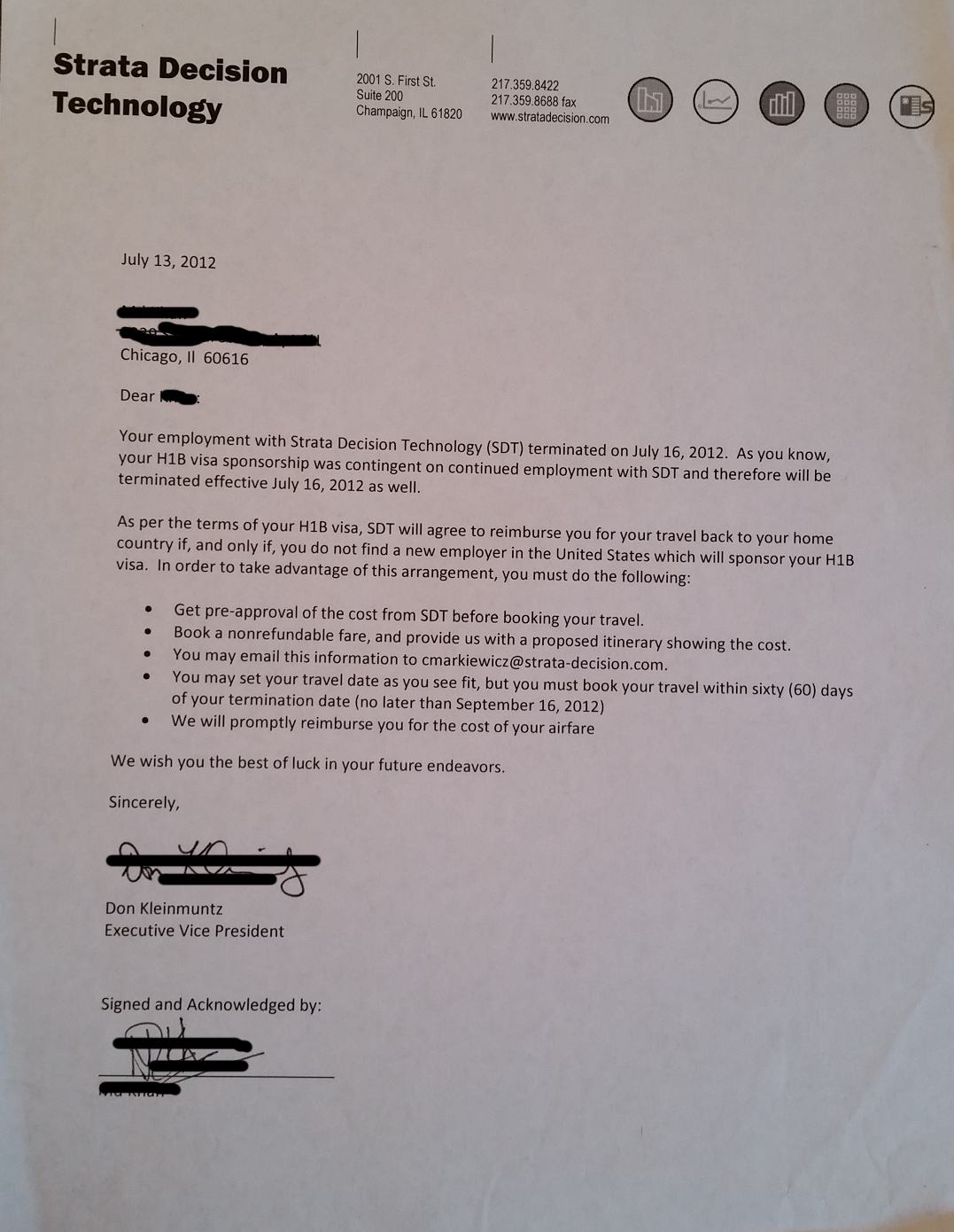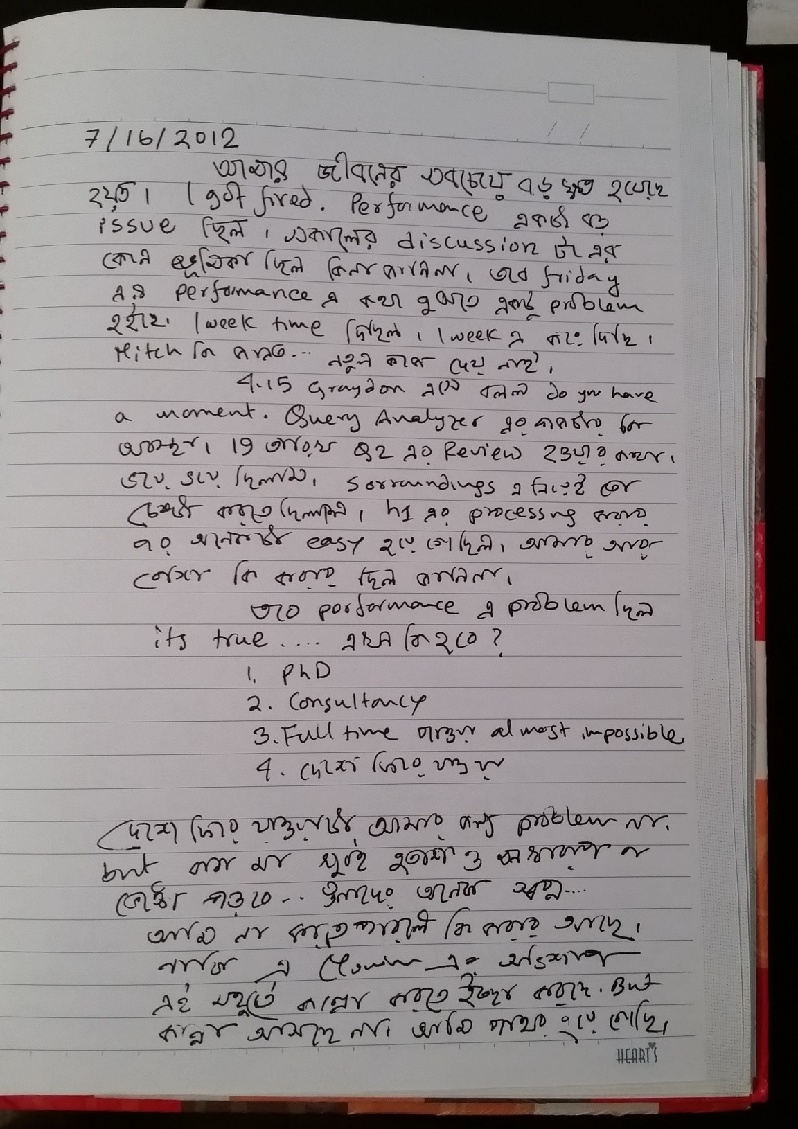 মে, ২০১২ তে কোম্পানি কয়েক হাজার ডলার খরচ করে আমার ওয়ার্ক পারমিট (H1B ) এর জন্য এপ্লাই করায় আমি ভাবছিলাম- আমি ভালো না করলেও আমাকে নিশ্চয়ই ফায়ার করবে না। করলে আমার পিছনে এতো খরচ করতো না। ২০১২ এর জুলাই এর ১৬ তারিখ বিকাল ৪টা ১৫ মিনিটে আমার বস আমাকে এসে বলে- "Do you have moment?" আমি তার সাথে সাথে একটা মিটিং রুমে গেলাম। সেখানে যাওয়ার পর বস বললো- We aren't happy with your performance. Today will be your last day here. We will provide you plane fare to go back to your country. তারপর আমার কাছ থেকে অফিসের দরজার চাবি নিয়ে নিলো। খুবই ঠাণ্ডা মেজাজে আমাকে নিয়ে আমার ডেস্কে এনে বললো- "Take all your personal belongings. I will walk you to the door".