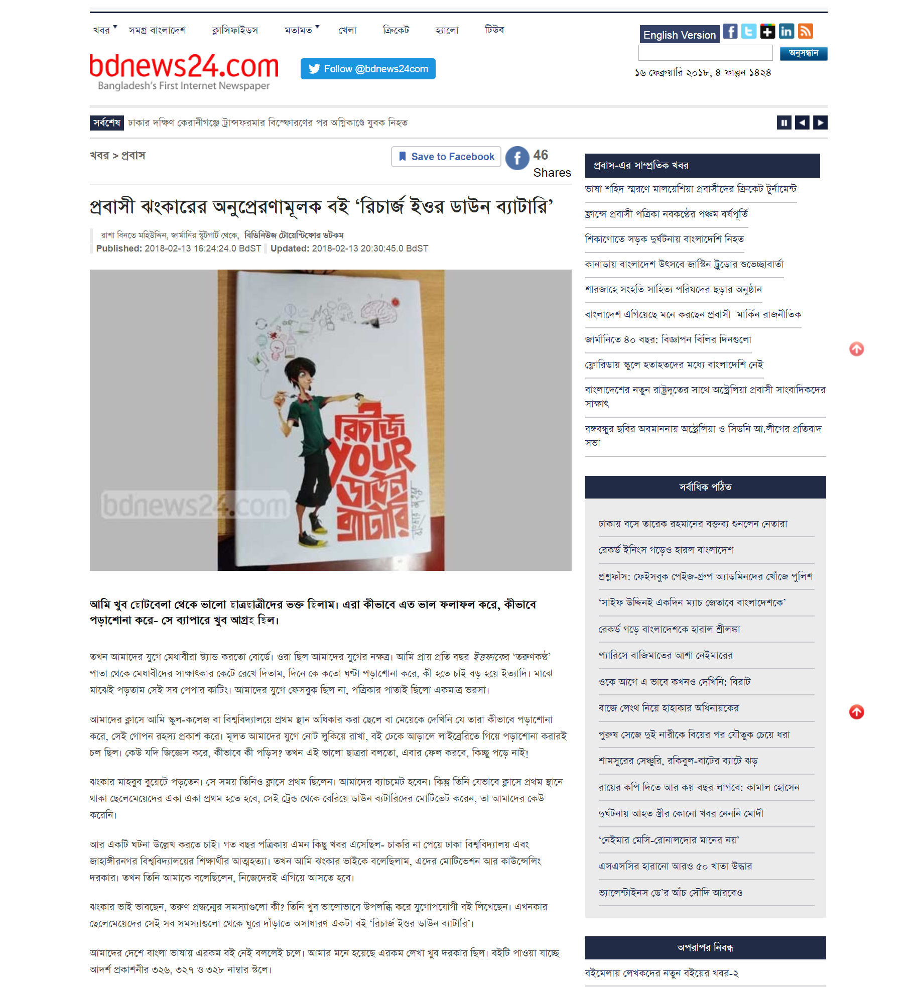 ঝংকার ভাই ভাবছেন, তরুণ প্রজন্মের সমস্যাগুলো কী? তিনি খুব ভালোভাবে উপলব্ধি করে যুগোপযোগী বই লিখেছেন। এখনকার ছেলেমেয়েদের সেই সব সমস্যাগুলো থেকে ঘুরে দাঁড়াতে অসাধারণ একটা বই ‘রিচার্জ ইওর ডাউন ব্যাটারি’।